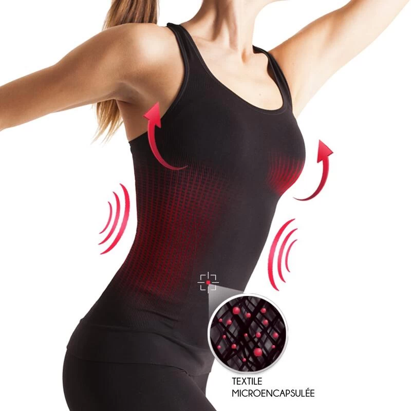 -Vormgevende tricot voor een betere houding en optimale ondersteuning -Tricot met verstevigde inzetstukken (buik, heupen, rug) -Zwemmersrug voor een perfecte ondersteuning -Mooi rond decolleté voor een vrouwelijke stijl -Tweede huid effect -Zacht en comfortabel -Stretch, bewegingsvrijheid -Oeko-Tex® label **Cosmetische werking: **Afslankende werking: Forskoline Verstevigende werking: Kleine hulst en Garcina Hydraterende werking: Zoete amandelolie Capsules bestand tegen meer dan 30 wasbeurten.