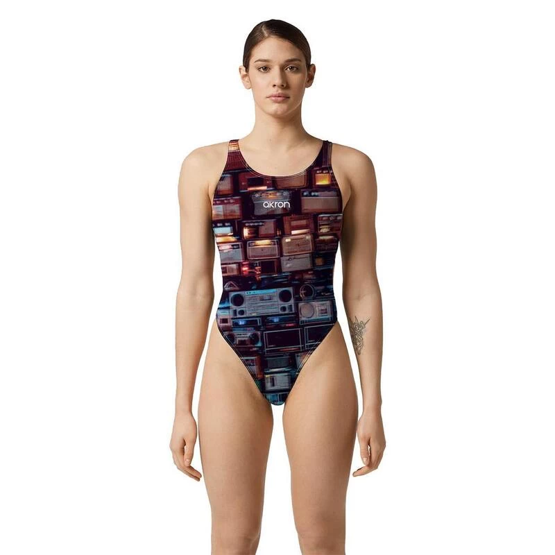 Dit zwempak heeft een op de radio geïnspireerde print waarmee je opvalt bij je volgende zwembadsessie.