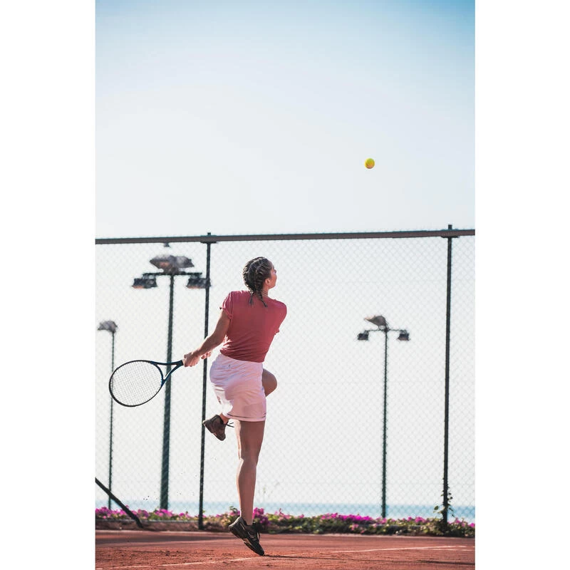 8666531Ons team ontwikkelde dit ecodesigned tennisshirt voor je trainingen of wedstrijden. Je kunt dit shirt het hele jaar door dragen, ongeacht de temperatuur.Dit shirt met korte mouwen zit comfortabel tijdens het tennissen doordat het zo zacht aanvoelt en dankzij de ademende stof op de rug. Het model is vrouwelijk en heel draagbaar.