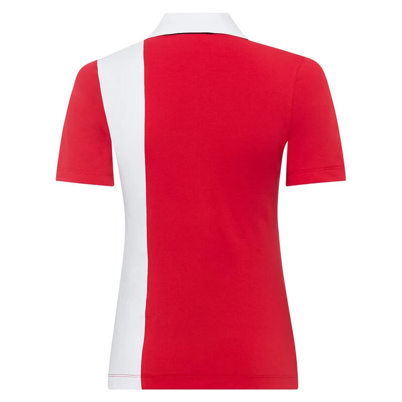 Een poloshirt met korte mouwen is een bewezen klassieker op de golfbaan. Het kledingstuk wordt hier gepresenteerd in een vrouwelijke, slanke pasvorm met een aantrekkelijke colorblocking-stijl. De typische geribde kraag en de knoopsluiting worden door contrasterende kleuren afgezet tegen de achtergrondkleur. Het geborduurde logo aan de onderkant van de zoom zorgt ook voor een contrasterend accent. De sportieve look wordt gecompleteerd door de hoge elasticiteit en de zonbeschermingsfactor 50 van het ingenieuze functionele materiaal. Een goede keuze die trendy design combineert met uitstekende draageigenschappen voor speelplezier. Het kledingstuk is in de EU geproduceerd. Zo garanderen we dat het kledingstuk onder eerlijke omstandigheden wordt vervaardigd en verminderen we de koolstofvoetafdruk door kortere transportroutes.Bescherming tegen de zonUPF 50 indexColorblocking designVijfknoops sluitingEmborduurwerk met glanzende elementenRibbed polohalsGOLFINO KnopenContrast inzetstuk