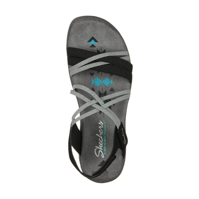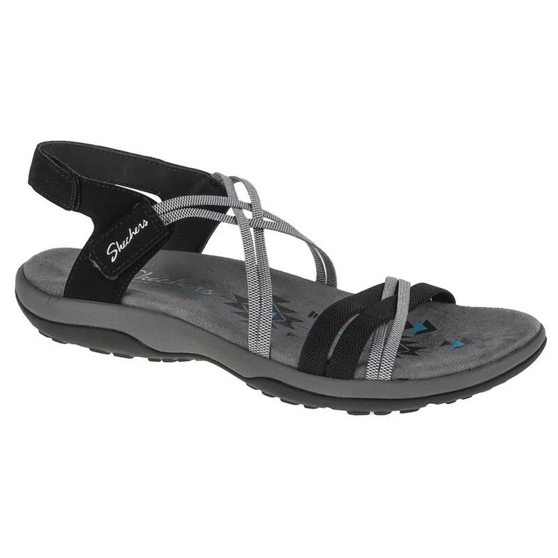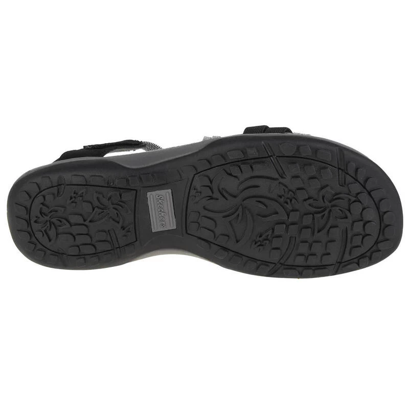 Deze sandaal heeft een bovenwerk van glad synthetisch leer en zachte stretchstof met een verstelbaar hielriempje en een gedempt voetbed Skechers Memory Foam.