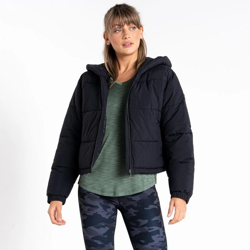 Deze gewatteerde jas is gerecycled en waterafstotend. Voor dames die willen wandelen.