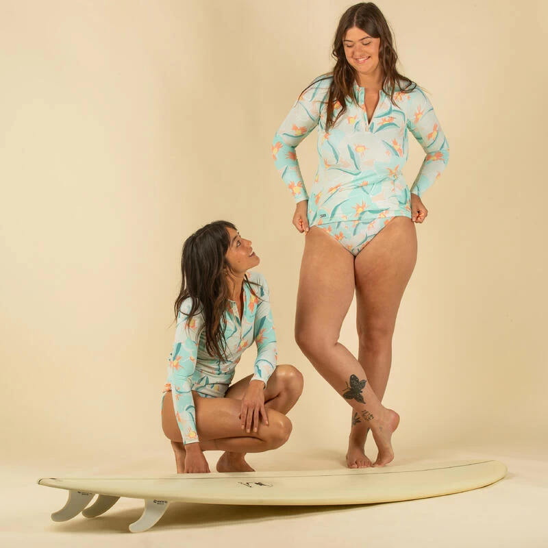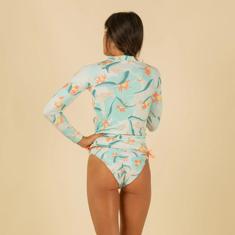 8756528Ons team, bestaande uit surfsters van elk niveau, ontwikkelde deze rashguard voor gevorderde surfsters die surfen op golven van minder dan een meter hoog.Uv-werende rashguard met lange mouwen die beschermt tegen de zon, zelfs in het water, en irritatie door het schuren van het board beperkt. Strikbandjes om vast te maken aan het broekje.