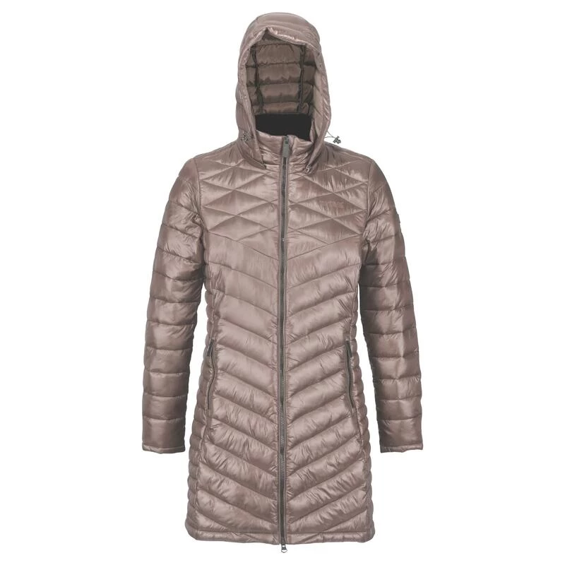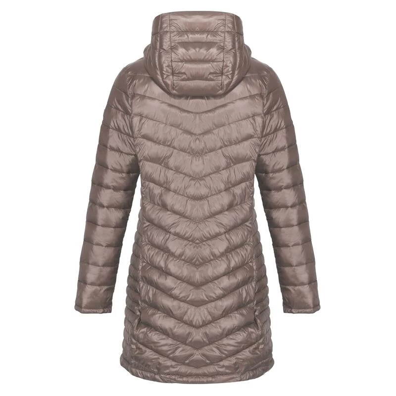 De Andel Jacket van Regatta voor dames is gemaakt van lichtgewicht polyamide met een duurzame, waterafstotende (DWR) afwerking en ademende Atomlight-vulling. Lang model met verstelbare capuchon. Bevat lage zakken met rits en Regatta Outdoors-opdruk op de borst.